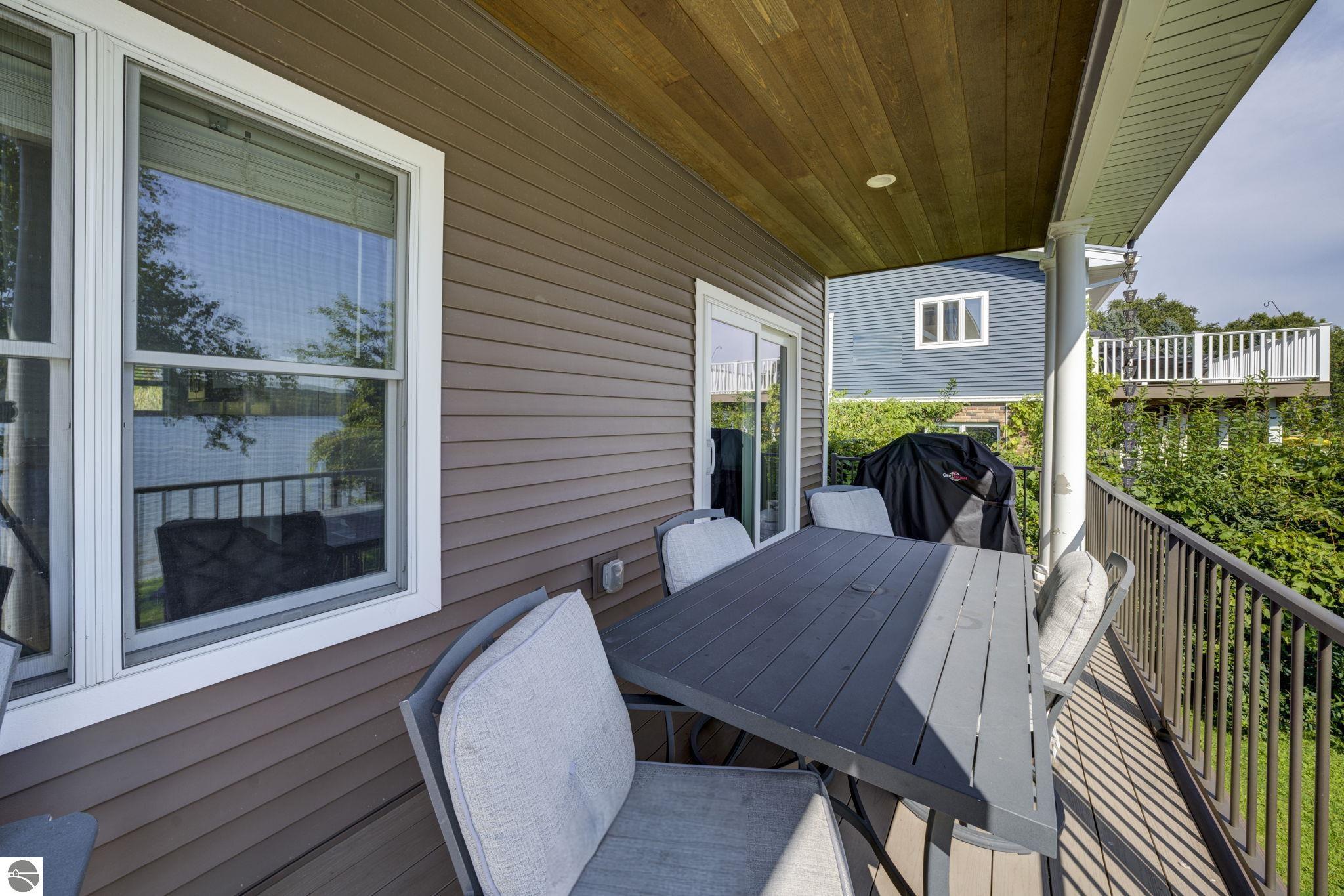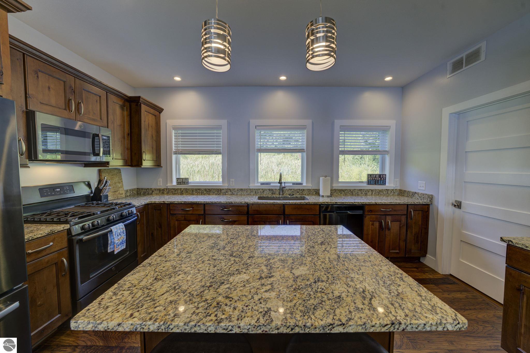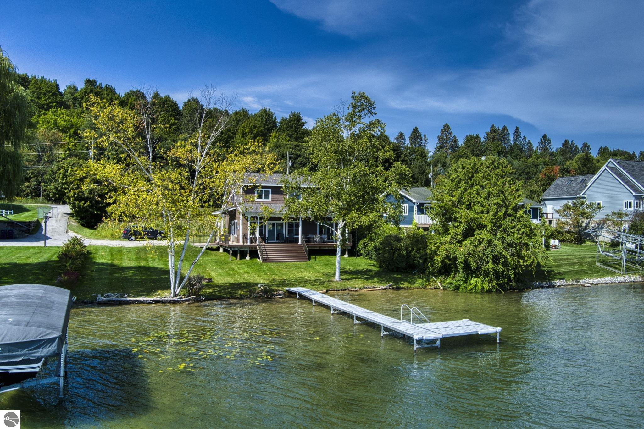 Enjoy the best of lakefront living with this spacious 5-bedroom, 2.5-bath craftsman-style home on 100 feet of private frontage on South Lake Leelanau. Designed for both comfort and gatherings, the home features an inviting covered porch and wraparound deck—perfect for soaking in sunrise views over the water. Inside, the main-floor primary suite offers lake views, direct deck access, and a private retreat feel. The open-concept living and dining area is anchored by large windows that frame the water, while the island kitchen shines with rich wood cabinetry, granite counters, and stainless-steel appliances. Upstairs, four bedrooms and a shared bath provide plenty of space for family and guests. With a sandy shoreline, private dock, and expansive outdoor spaces, this property is ideal for summer days on the water, cozy evenings on the porch, and year-round enjoyment. Whether you’re seeking a vacation getaway or a full-time residence, this two-story home offers a rare opportunity to own lakefront property in the heart of Leelanau County. Home is being sold Turn Key. Includes furnishings, dock, kitchenware and linens.